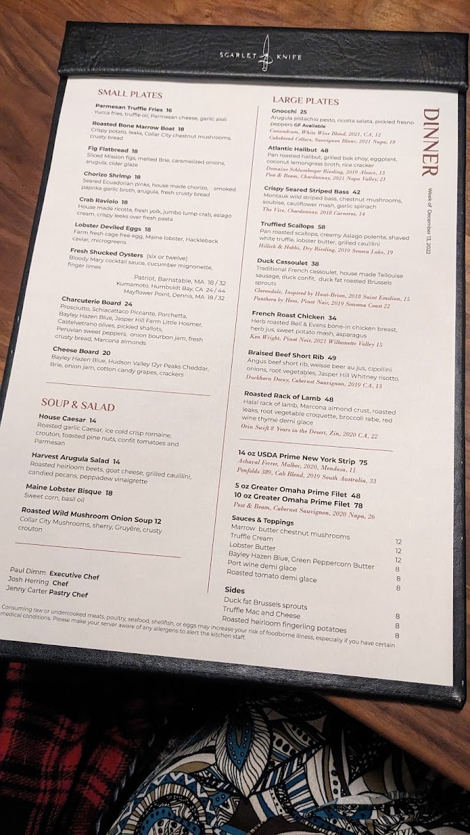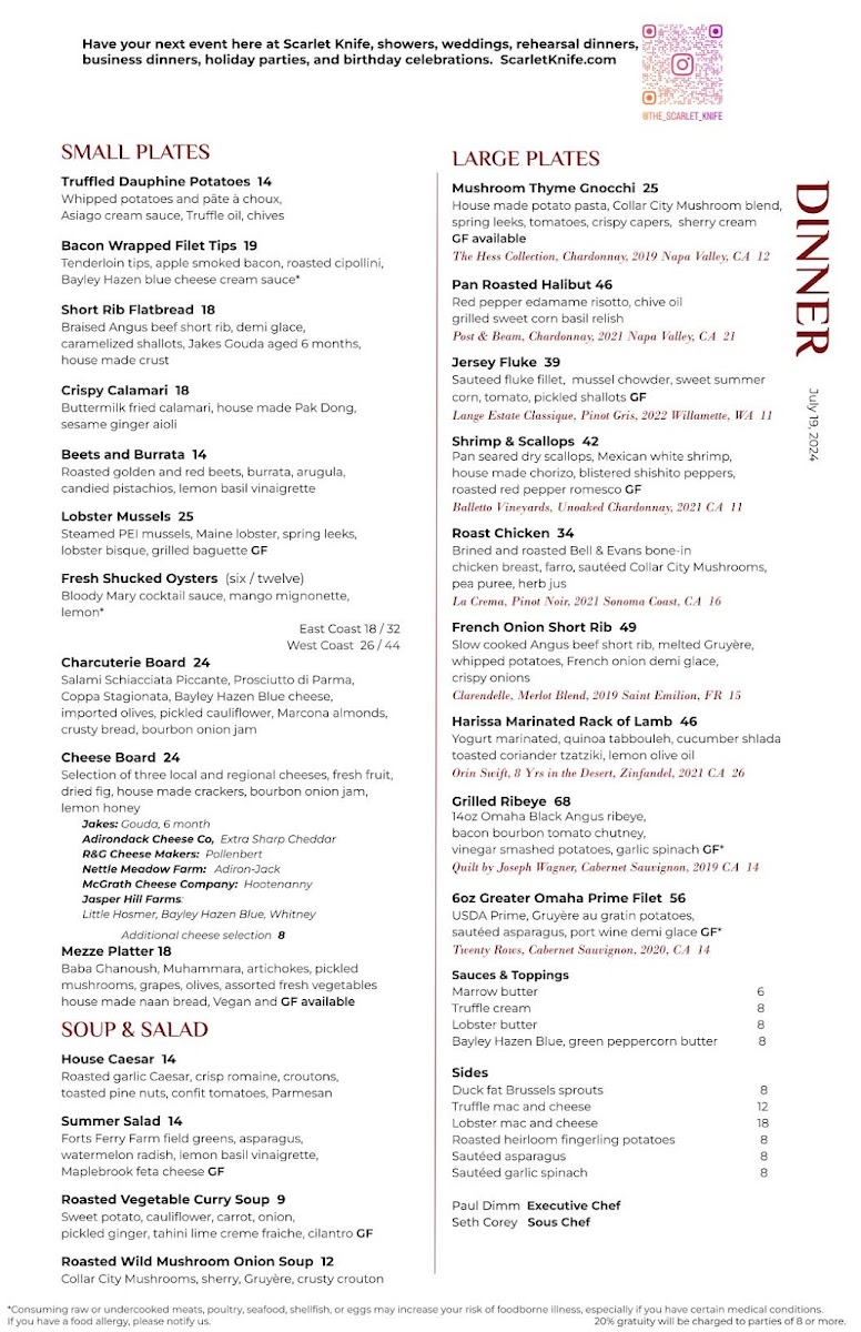 The menu at Scarlet Knife offers a refined yet approachable dining experience where thoughtful preparation and fresh ingredients take center stage. This is a place where simple favorites meet thoughtful seasonal touches, ideal for both relaxed weeknight dinners and special occasions.